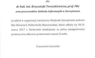 Wyróżnienie dla pracy magisterskiej Pana Marcina Dula, absolwenta kierunku logistyka, wykonanej pod kierunkiem dr hab. inż. Krzysztofa Tereszkiewicza, prof. PRz.