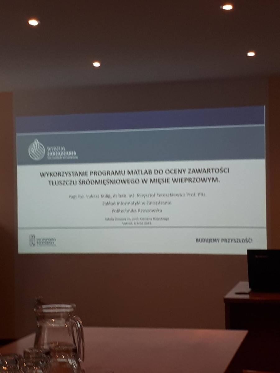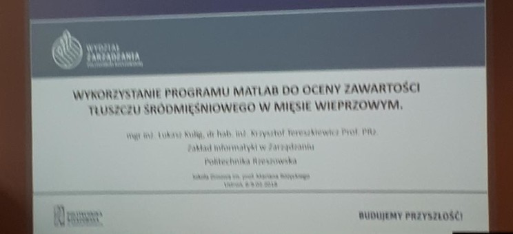 Pracownicy naszego Zakładu uczestniczyli w dniach 6-9.02.2018 w Ustroniu w XI Szkole Zimowej im. Profesora Mariana Różyckiego. Podczas wykładów swój referat pt. "Wykorzystanie programu Matlab do oceny zawartości tłuszczu śródmięśniowego w mięsie wieprzowym" przedstawił Łukasz Kulig i w konkursie na najlepszą prezentację zdobył 3 miejsce.